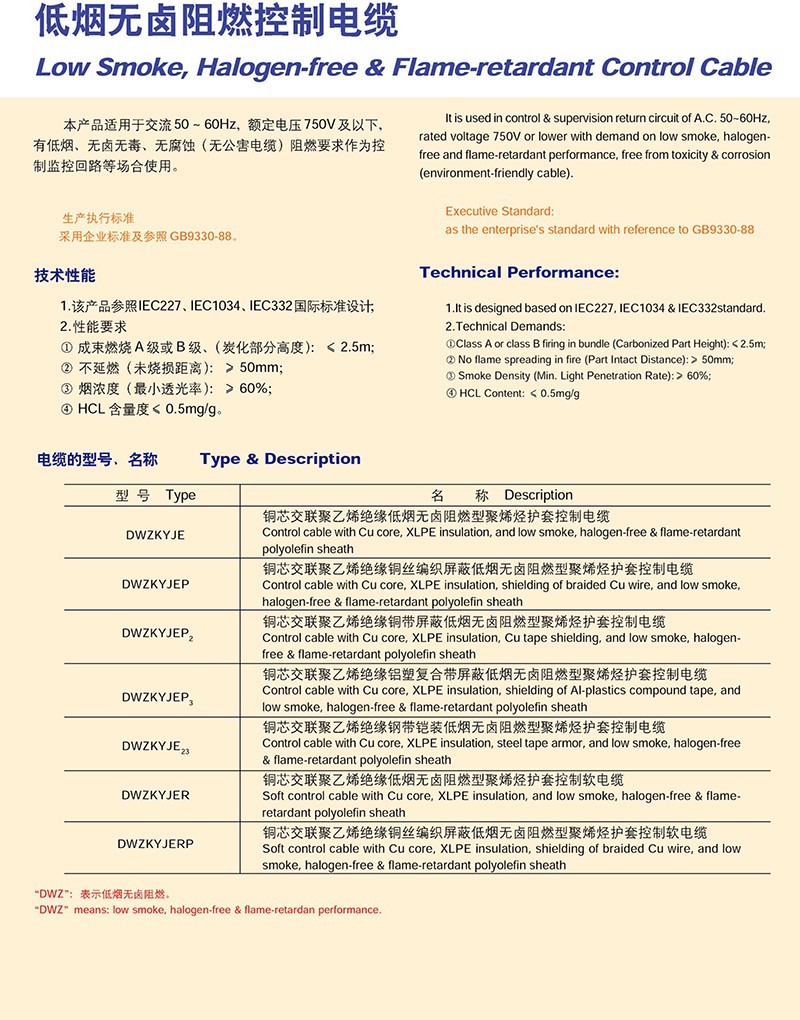 低煙無鹵阻燃控制電纜的產(chǎn)品詳細介紹: